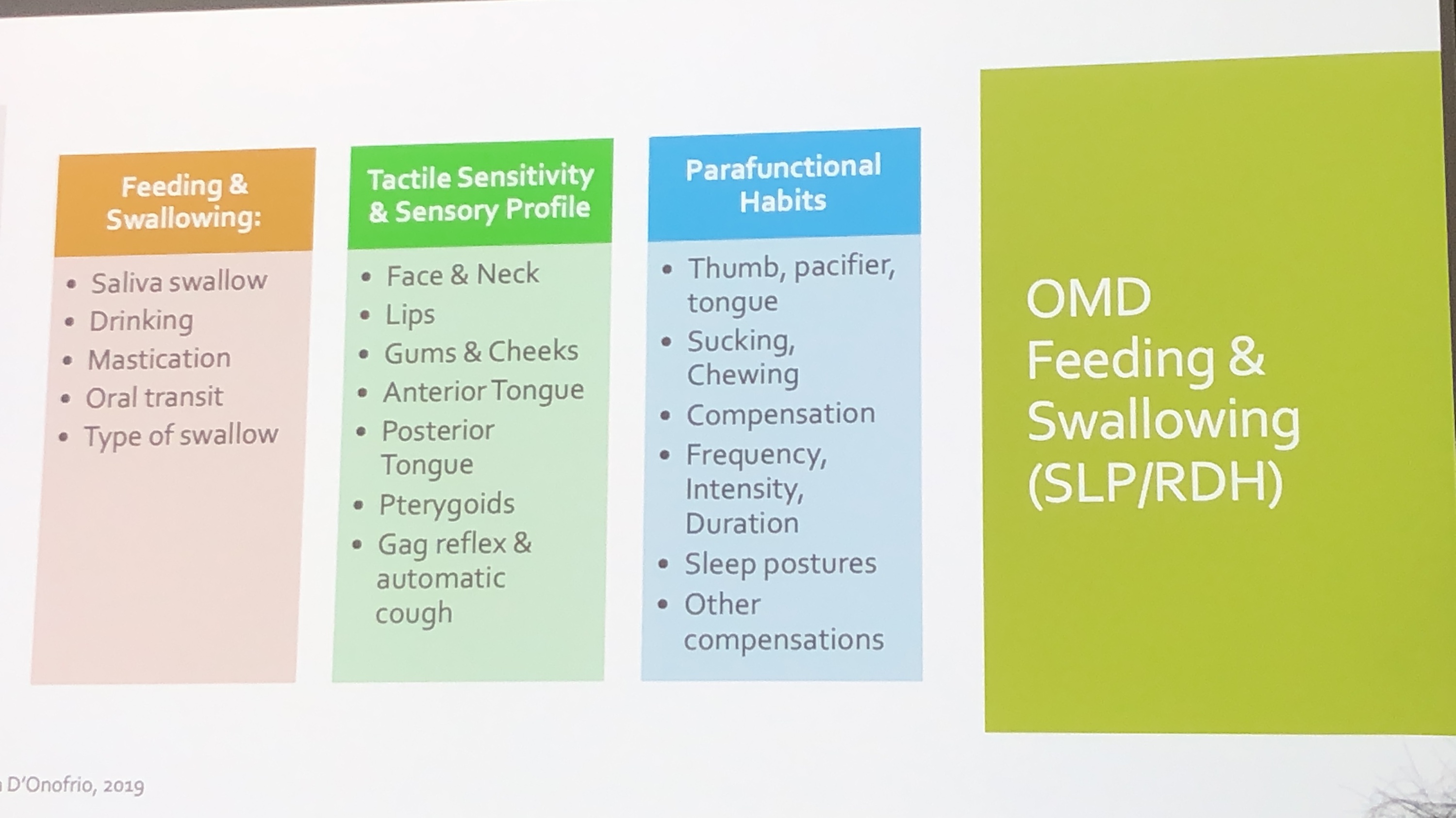 また、今回は言語療法士の先生のプレゼンテーションも有りました。アメリカの先生でしたが、矯正医からの紹介で来られる事が多いそうです。手技では改善しない「不良習癖」に焦点を当て、筋肉の状態や嚥下の状態、姿勢を観察し、改善させるプログラムを担当するそうです。